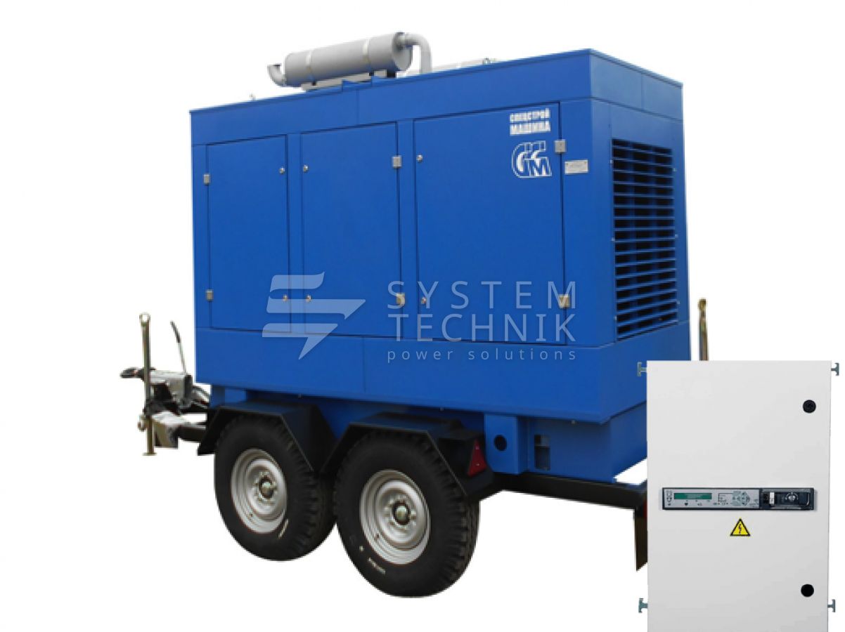 - ССМ ЭД-75-Т400-2РКМ2 (Marelli) в шумозащитном кожухе на шасси с АВР на прицепе